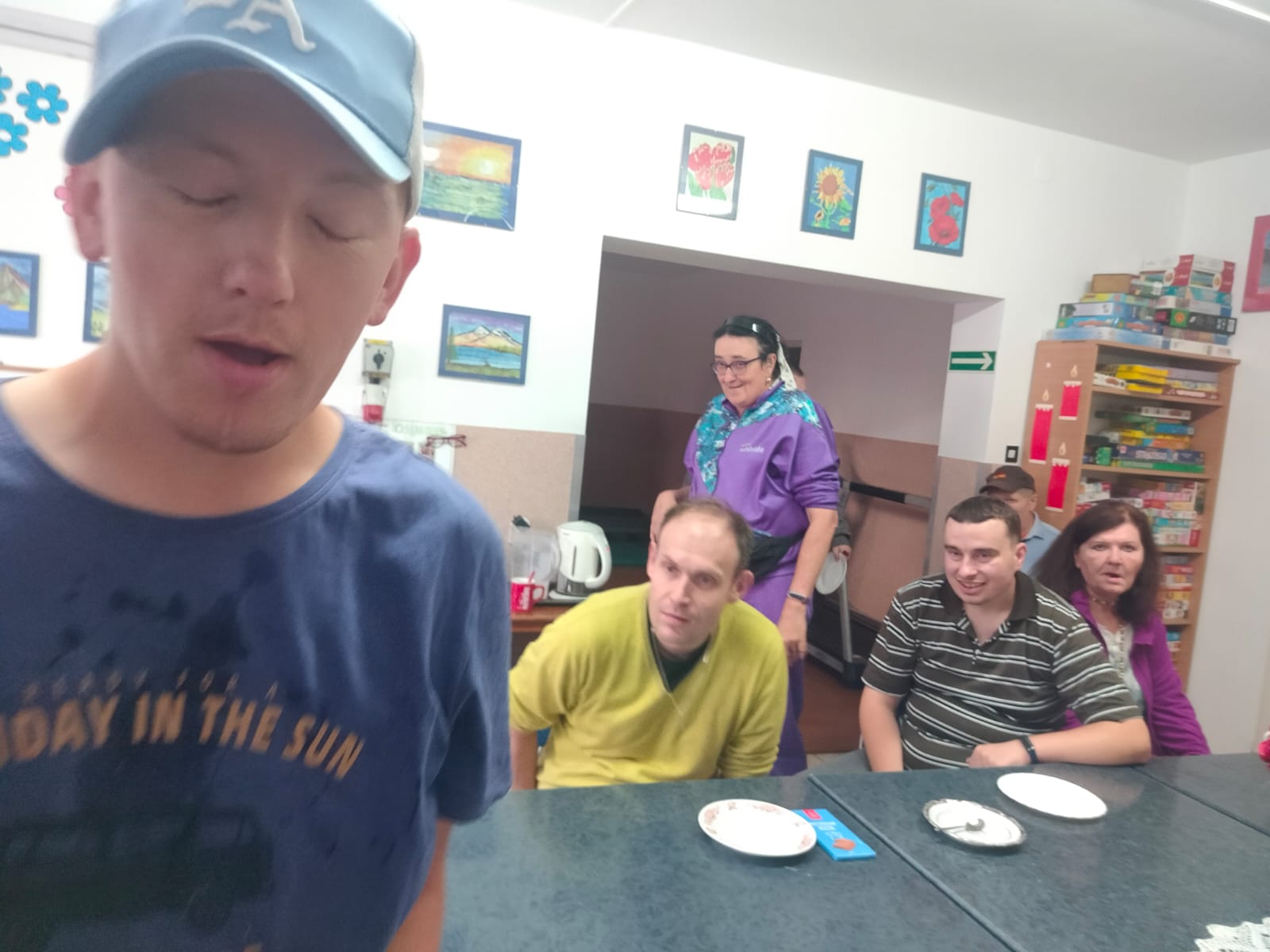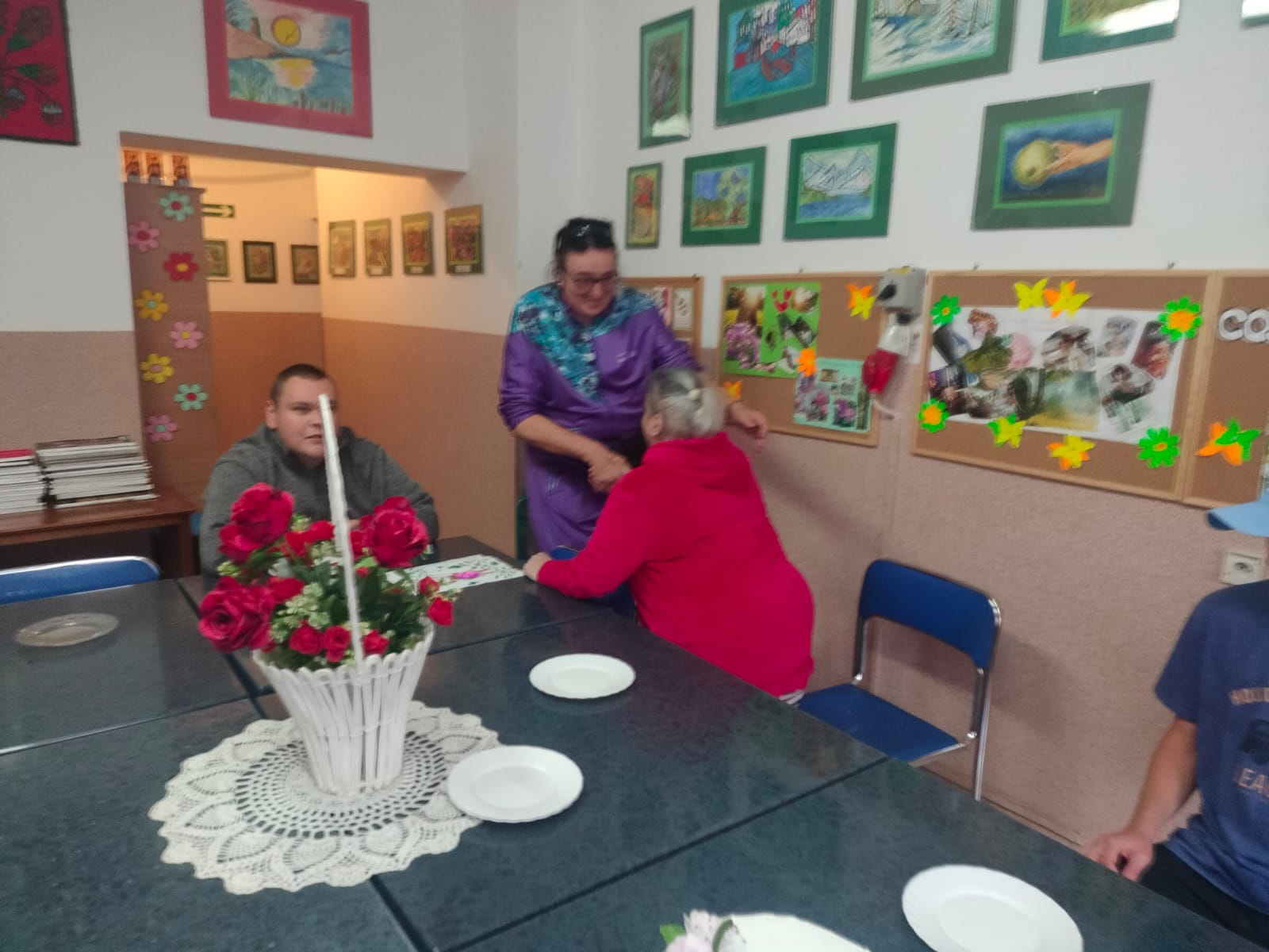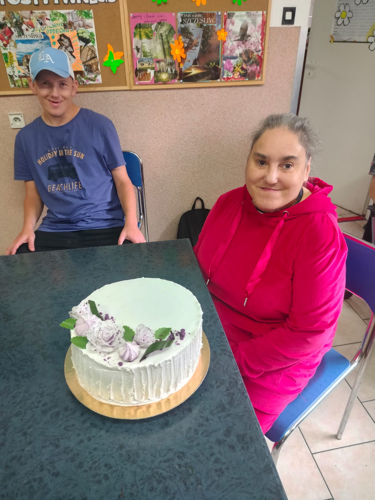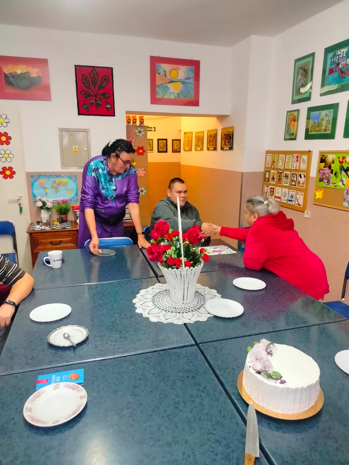 Z tej okazji przygotowano kameralne, a zarazem niezwykle ciepłe spotkanie. Opiekunka zadbała o słodki akcent uroczystości, kupując torty, które stały się centralnym punktem stołu. Pani Ewa, w roli gospodyni, z uśmiechem zaprosiła swoich gości – współmieszkańców Ośrodka – by wspólnie świętować ten szczególny dzień.