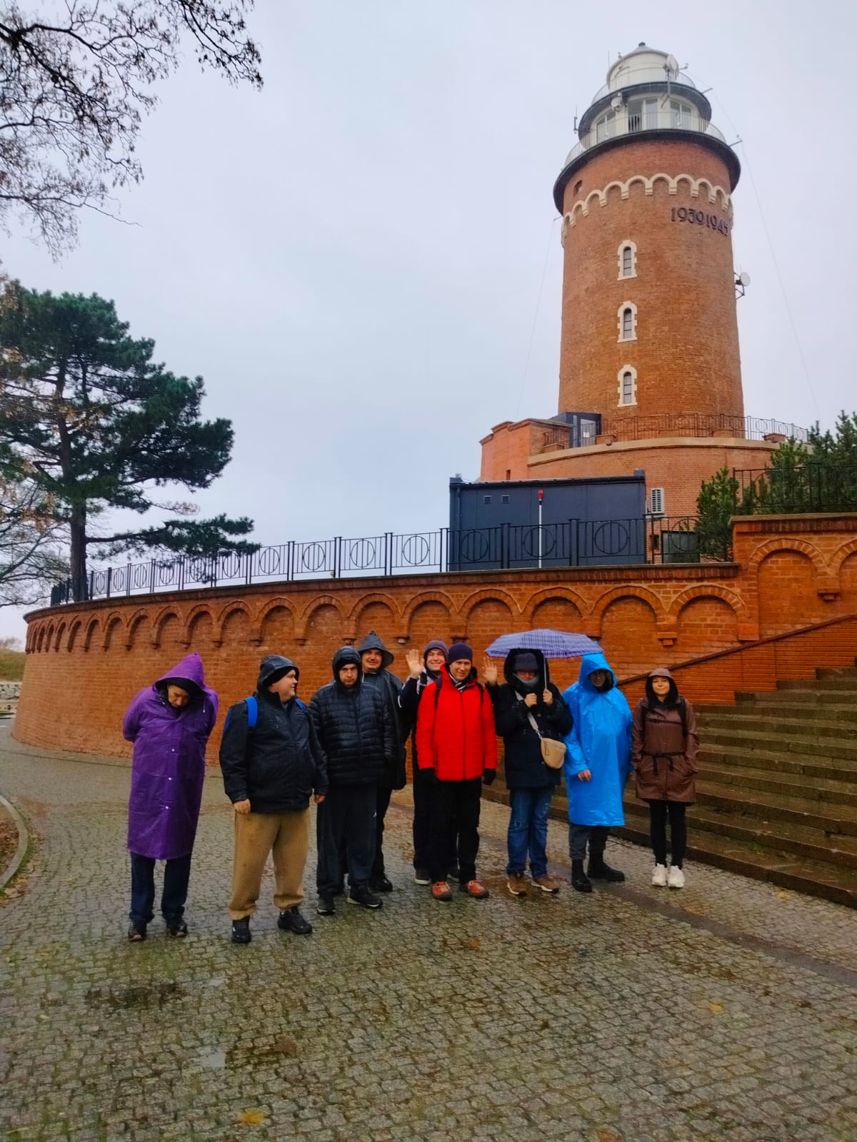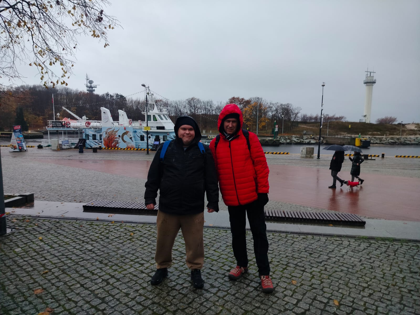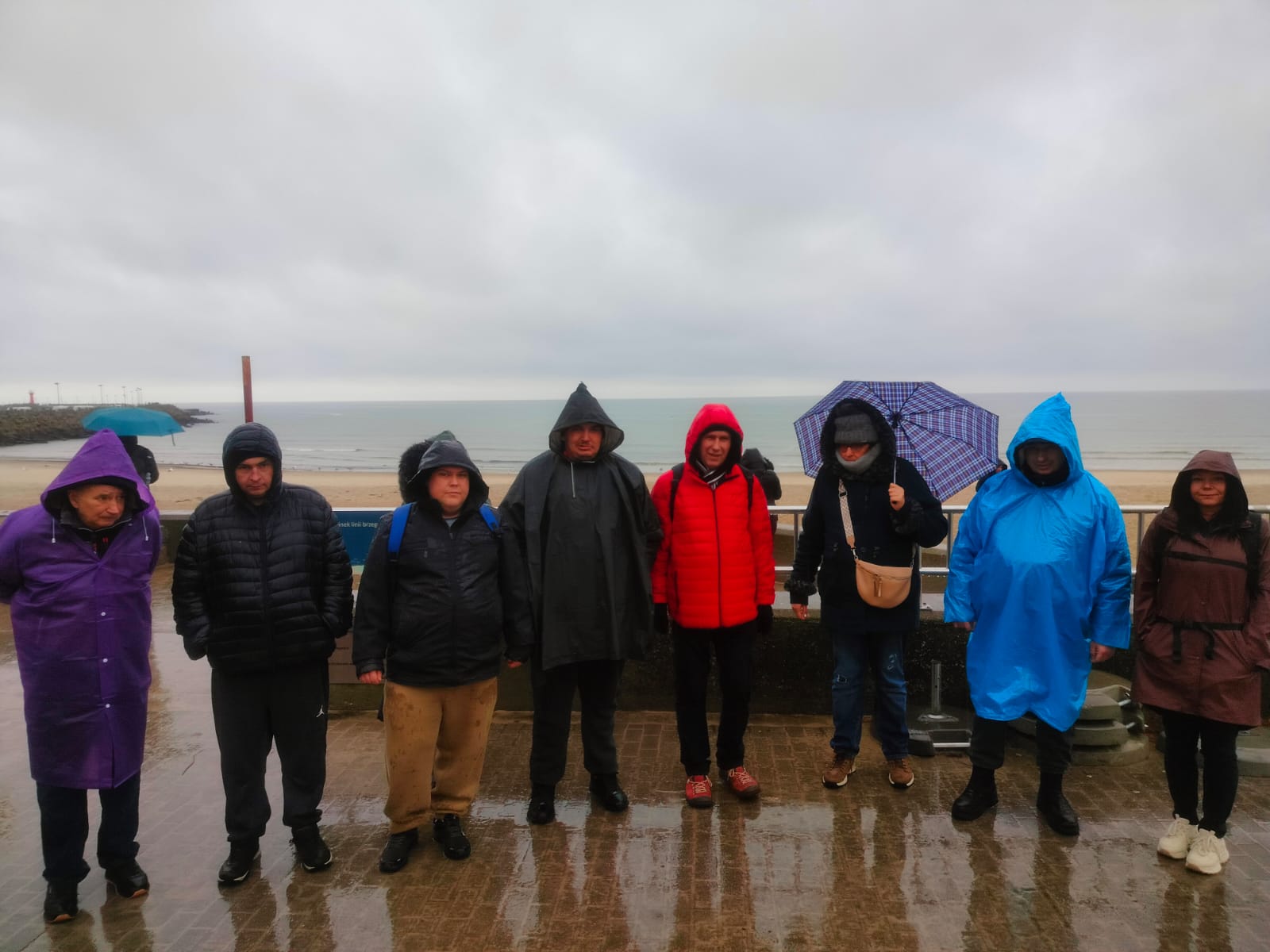 Pogoda niestety nie sprzyjała długim spacerom, ale nawet przelotnie udało się zobaczyć kilka najważniejszych miejsc: fragment nadmorskiej promenady, okolice portu oraz molo tonące w deszczowej mgle. To był raczej rekonesans niż zwiedzanie, ale wszyscy potraktowali wyprawę z dużym poczuciem humoru.